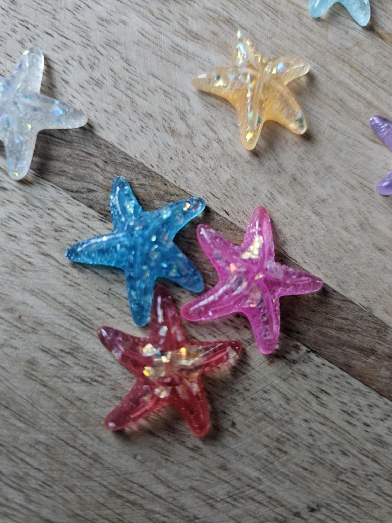 Loose parts zijn een fantastische toevoeging aan een speel/ werkplek. Deze zeesterren zijn gemaakt van hars en in de hars zitten glitters verwerkt.