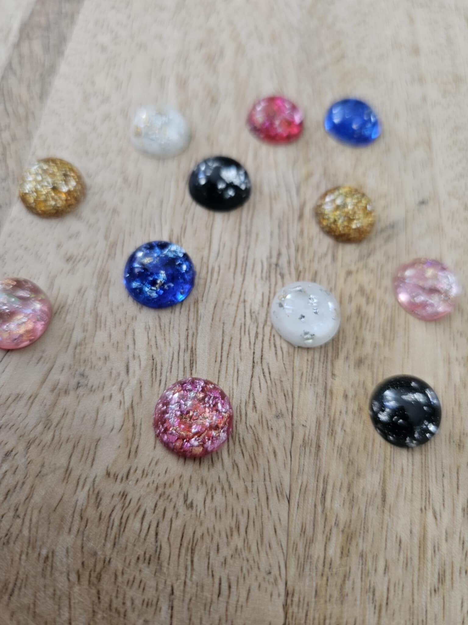 Loose parts zijn een fantastische toevoeging aan een speel/ werkplek. Deze halve cirkels zijn gemaakt van epoxy hars en hierin zijn glitters verwerkt.
