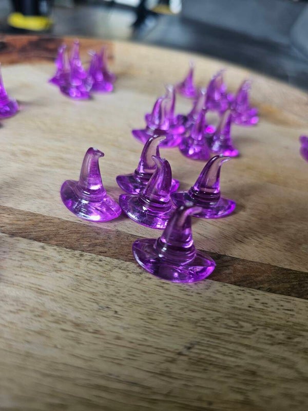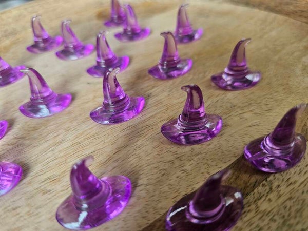 Loose parts zijn een fantastische toevoeging aan een speel/ werkplek. Deze heksenhoedjes zijn gemaakt van acryl en ze zijn doorzichtig paars.