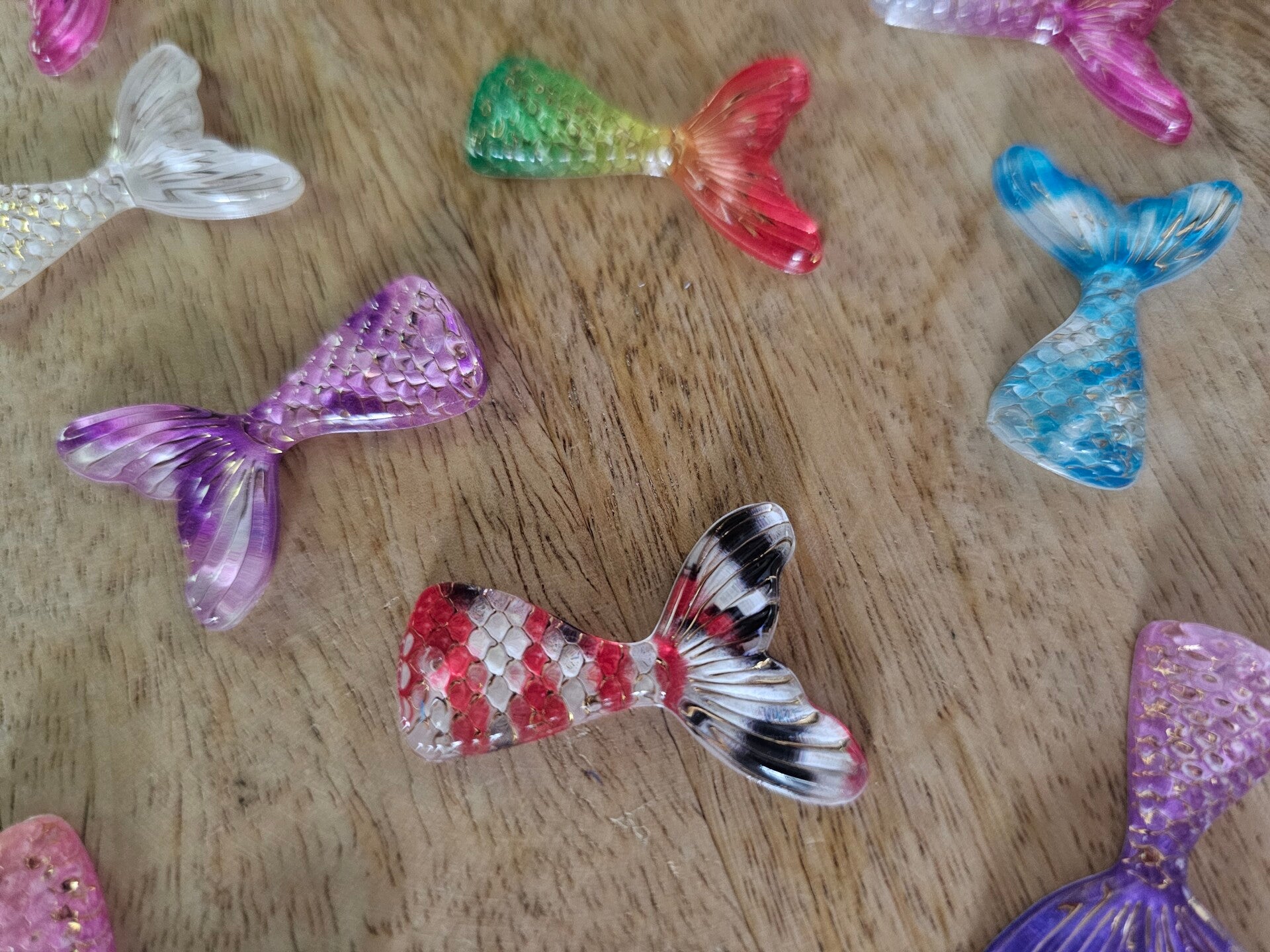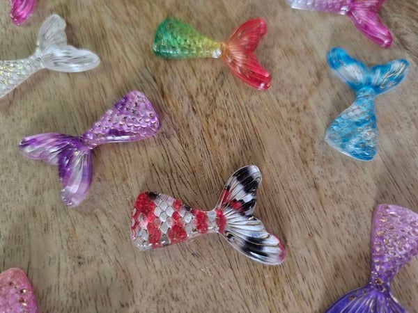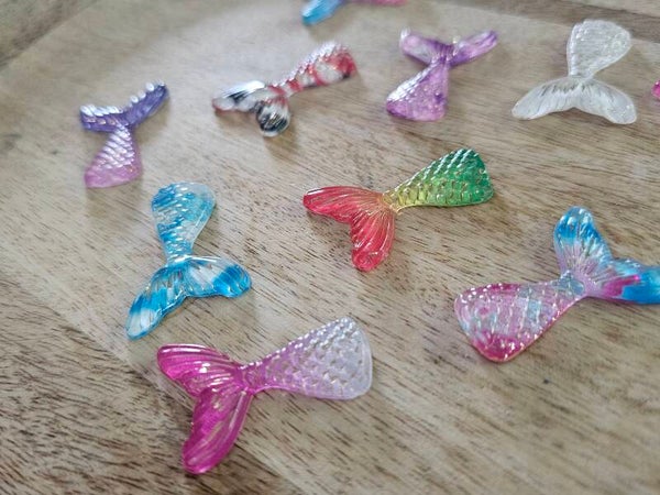 Loose parts zijn een fantastische toevoeging aan een speel/ werkplek. Deze zeemeerminnenstaarten zijn gemaakt van hars: In de hars zitten glitters verwerkt.