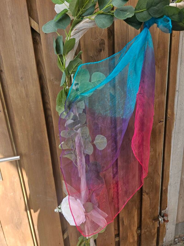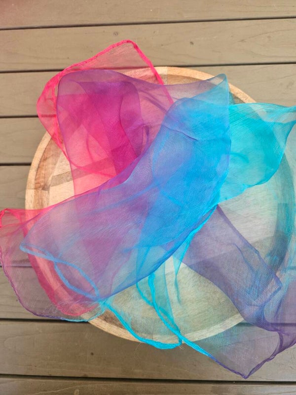Dit danssjaaltje heeft 3 kleuren lichtblauw, paars en donkerroze. De kleuren lopen in elkaar over. Dit geeft echt een prachtig effect.