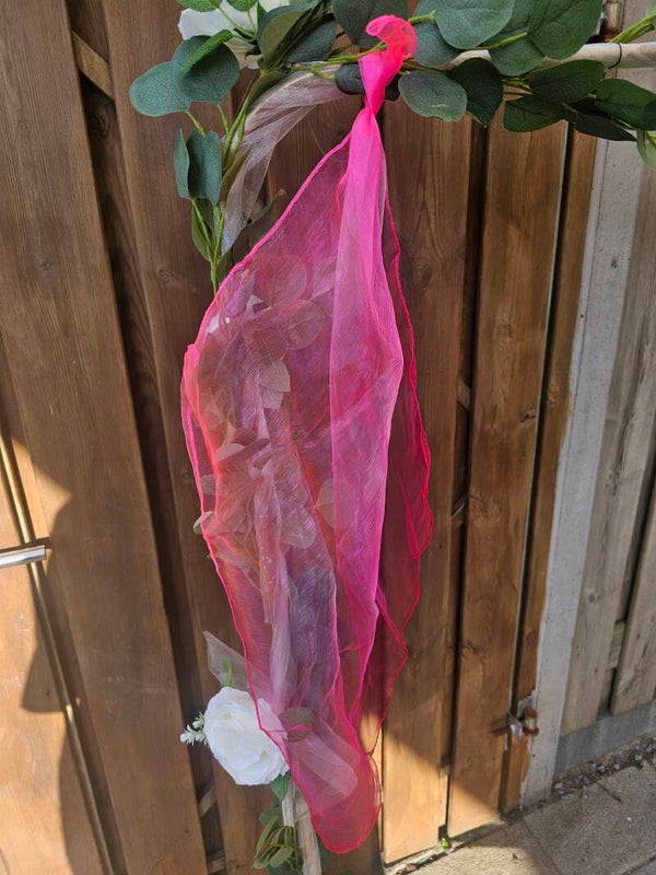 Dit danssjaaltje heeft 2 kleuren lichtroze en donkerroze. De kleuren lopen in elkaar over. Dit geeft echt een prachtig effect.