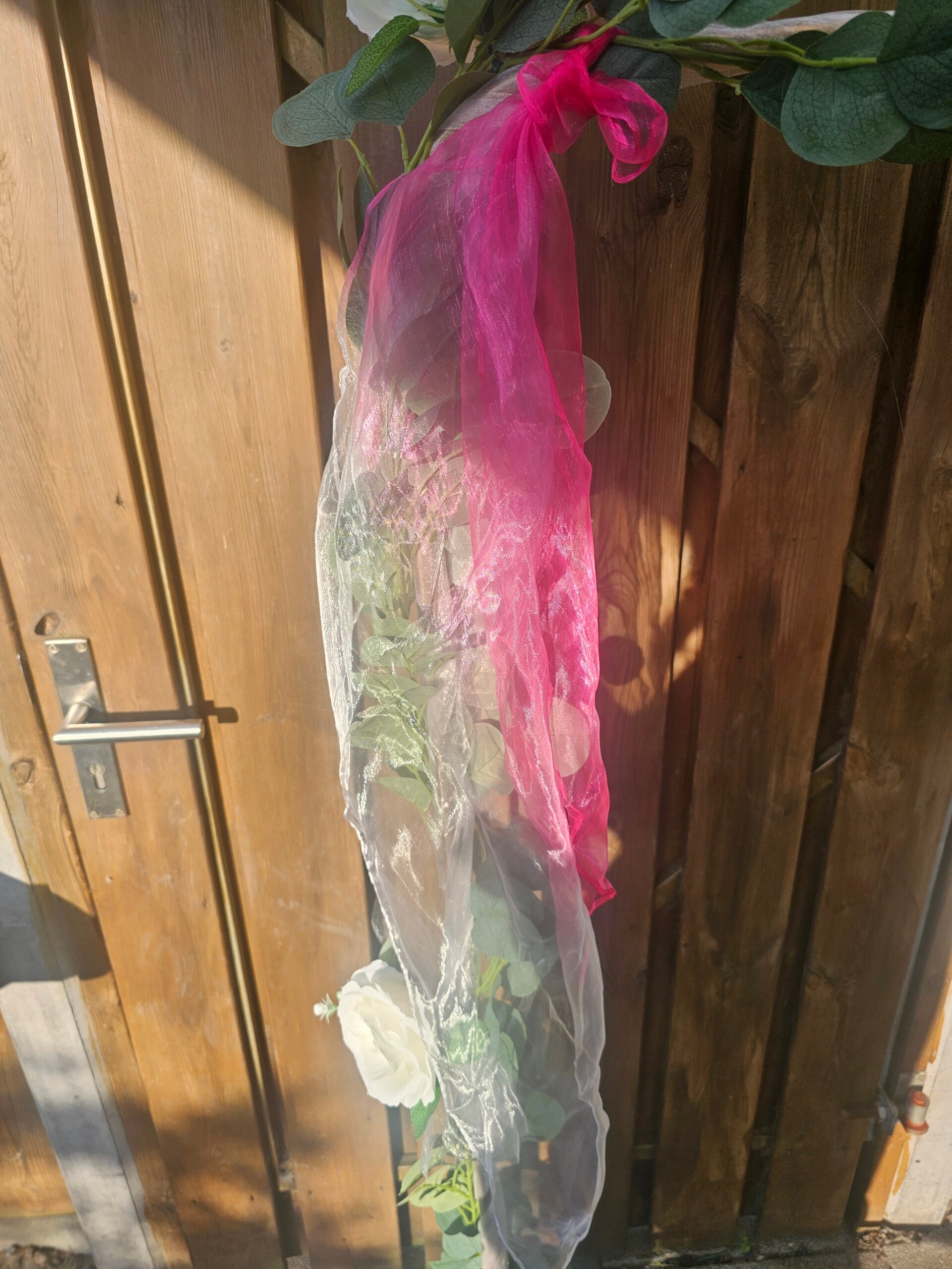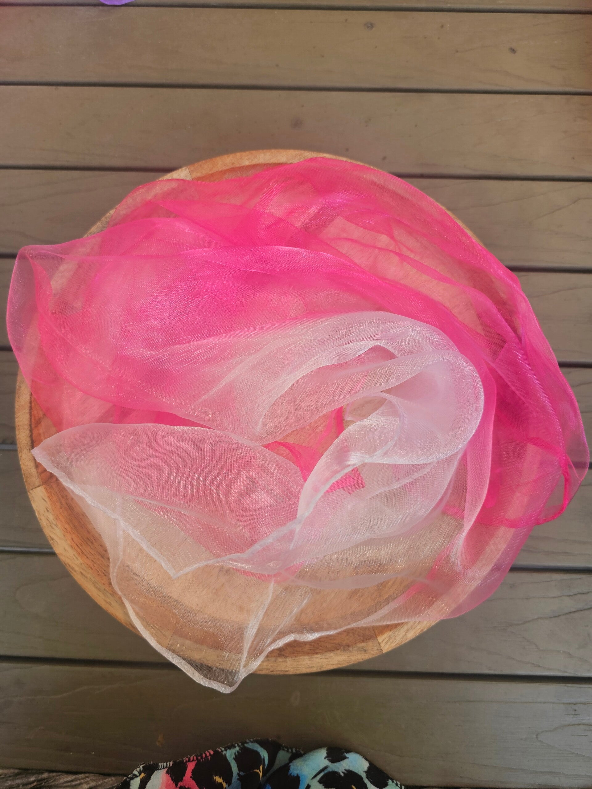 Dit danssjaaltje heeft 2 kleuren wit en roze. De kleuren lopen in elkaar over. Dit geeft echt een prachtig effect.