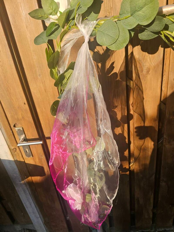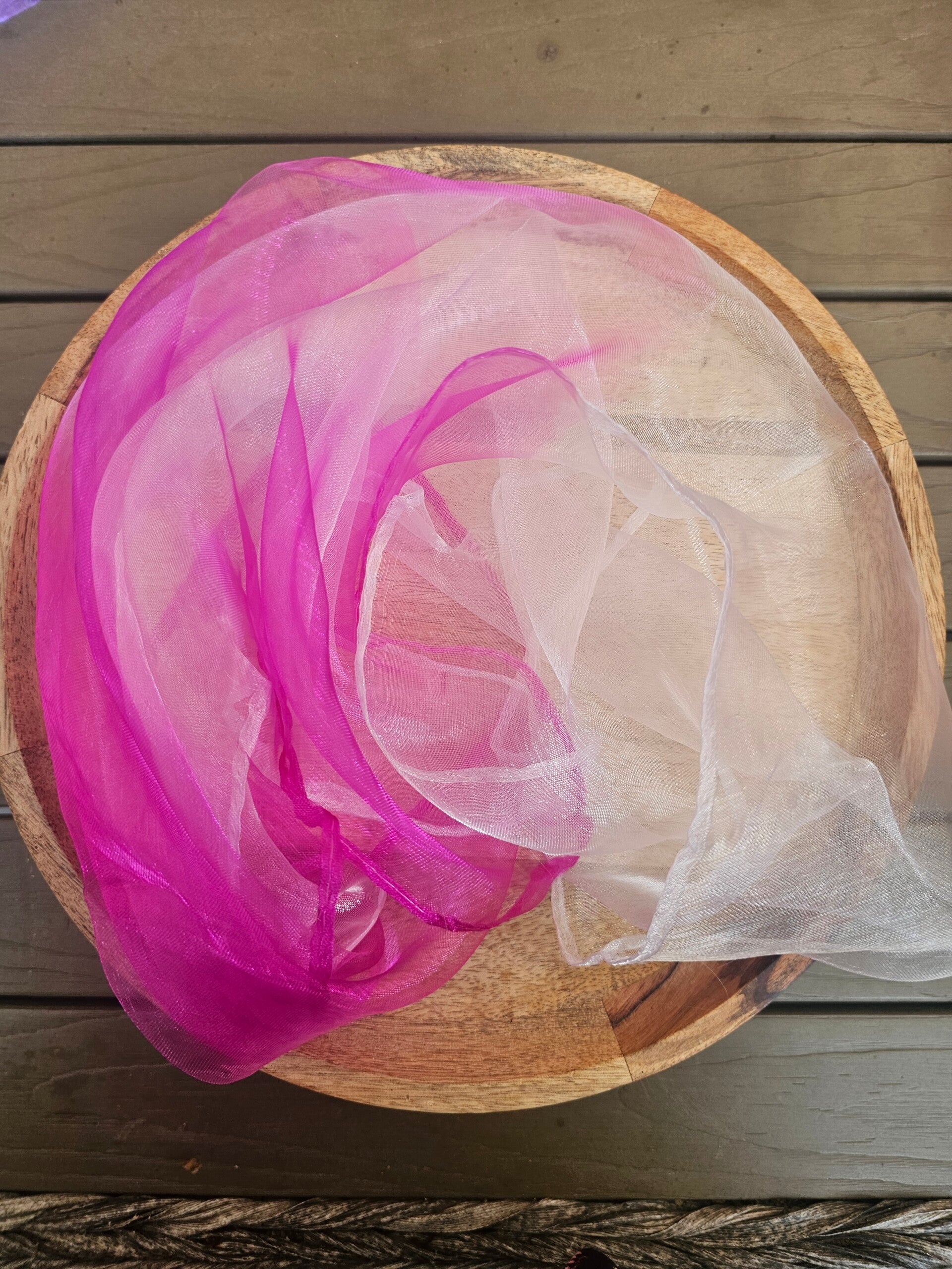 Dit danssjaaltje heeft 2 kleuren wit en fuchsia. De kleuren lopen in elkaar over. Dit geeft echt een prachtig effect.