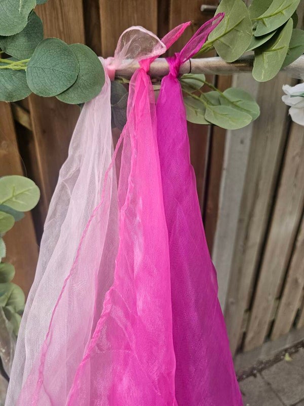 Dit setje dans sjaals heeft 3 kleuren roze. Het zijn zachte, gladde sjaals en fijn in gebruik.