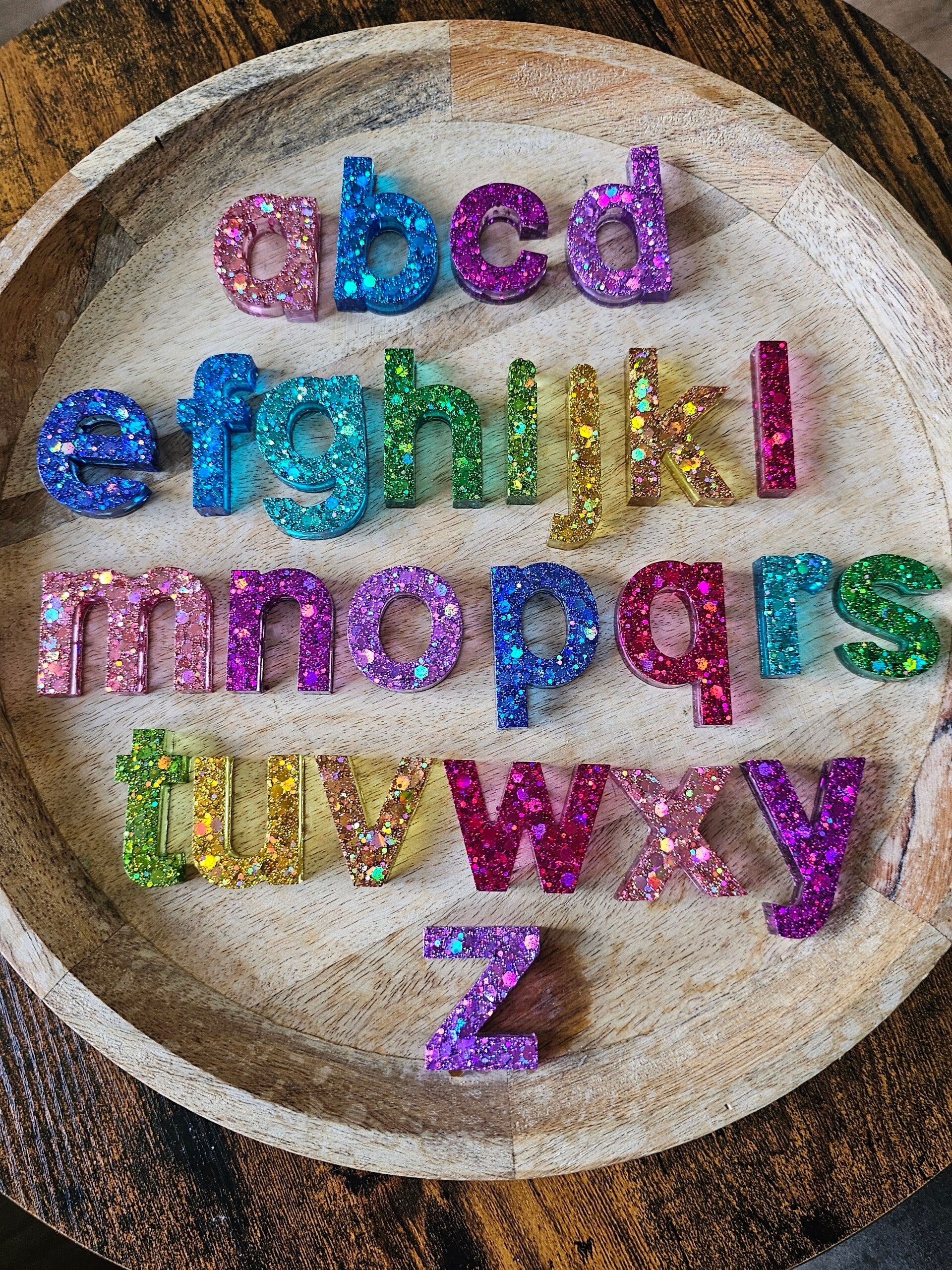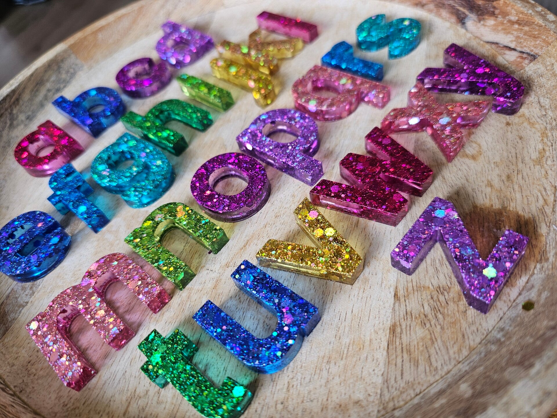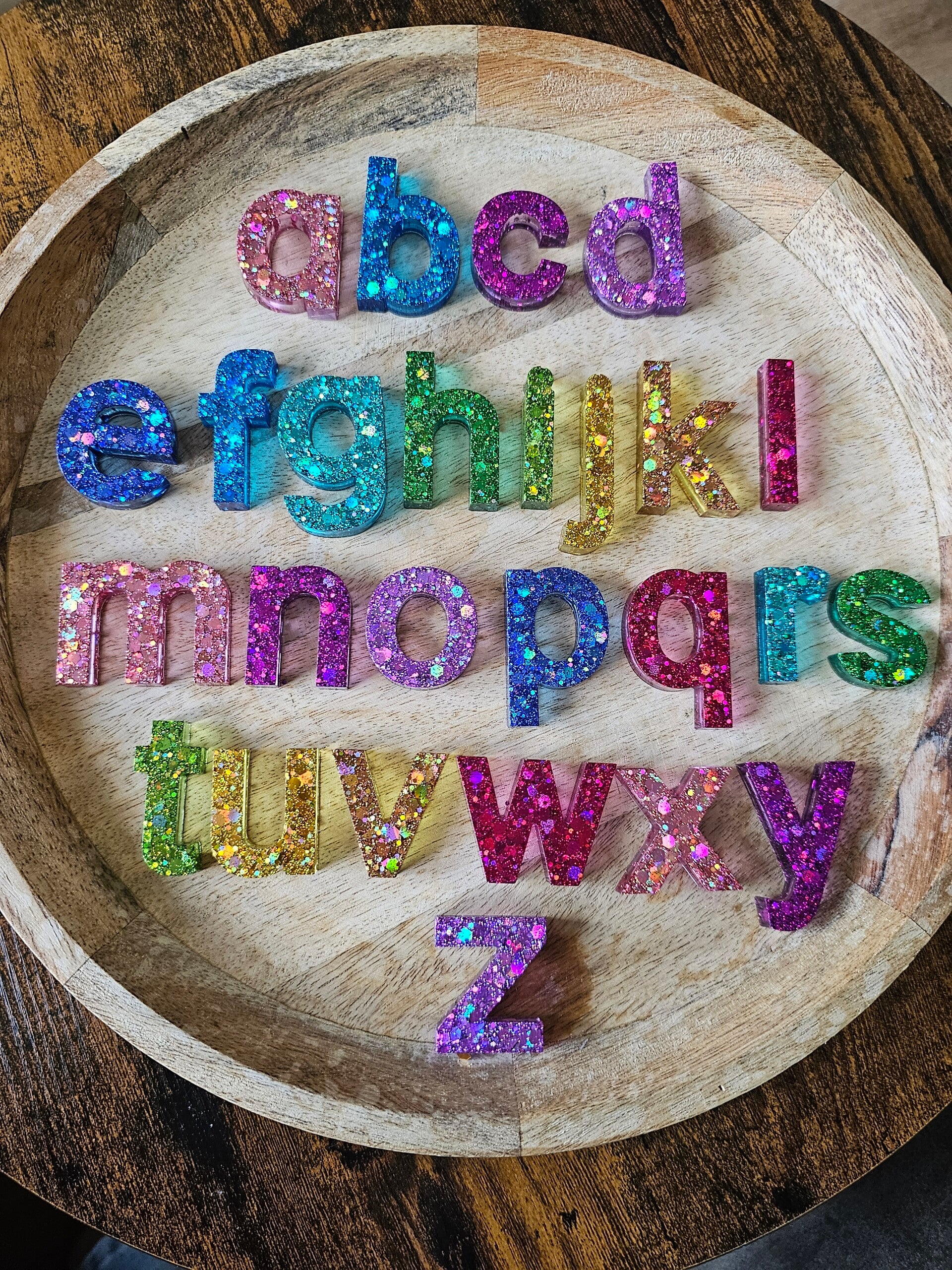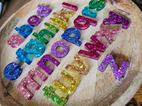 Loose parts zijn een fantastische toevoeging aan een speel/ werkplek. Deze prachtige letters zijn gemaakt van epoxy. De letters zijn doorzichtig met super veel glitters wat bijvoorbeeld een fantastisch effect geeft op een lichttafel of in een watertafel. En in een zandtafel geeft dit een super tof stempel effect.