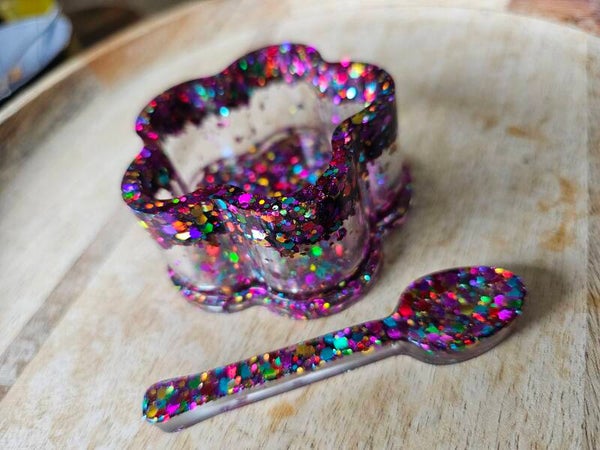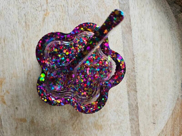 Loose parts zijn een fantastische toevoeging aan een speel/ werkplek. Dit prachtige bakje is gemaakt van epoxy. De bakjes zijn doorzichtig met super veel glitters wat bijvoorbeeld een fantastisch effect geeft op een lichttafel of in een watertafel.