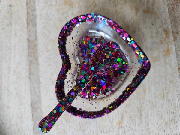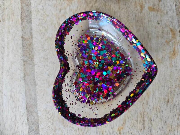 Loose parts zijn een fantastische toevoeging aan een speel/ werkplek. Dit prachtige bakje is gemaakt van epoxy. De bakjes zijn doorzichtig met super veel glitters wat bijvoorbeeld een fantastisch effect geeft op een lichttafel of in een watertafel.