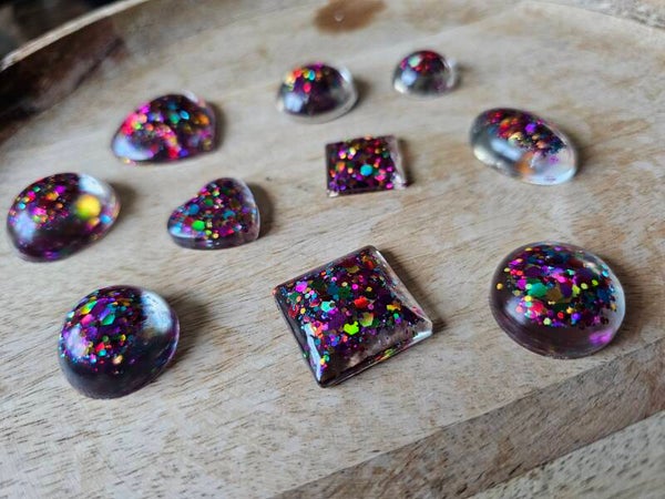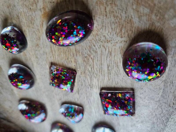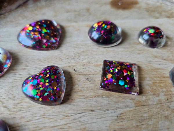 Loose parts zijn een fantastische toevoeging aan een speel/ werkplek. Deze prachtige vormen zijn gemaakt van epoxy. De vormen zijn doorzichtig met super veel glitters wat bijvoorbeeld een fantastisch effect geeft op een lichttafel of in een watertafel. En in een zandtafel geeft dit een super tof stempel effect.