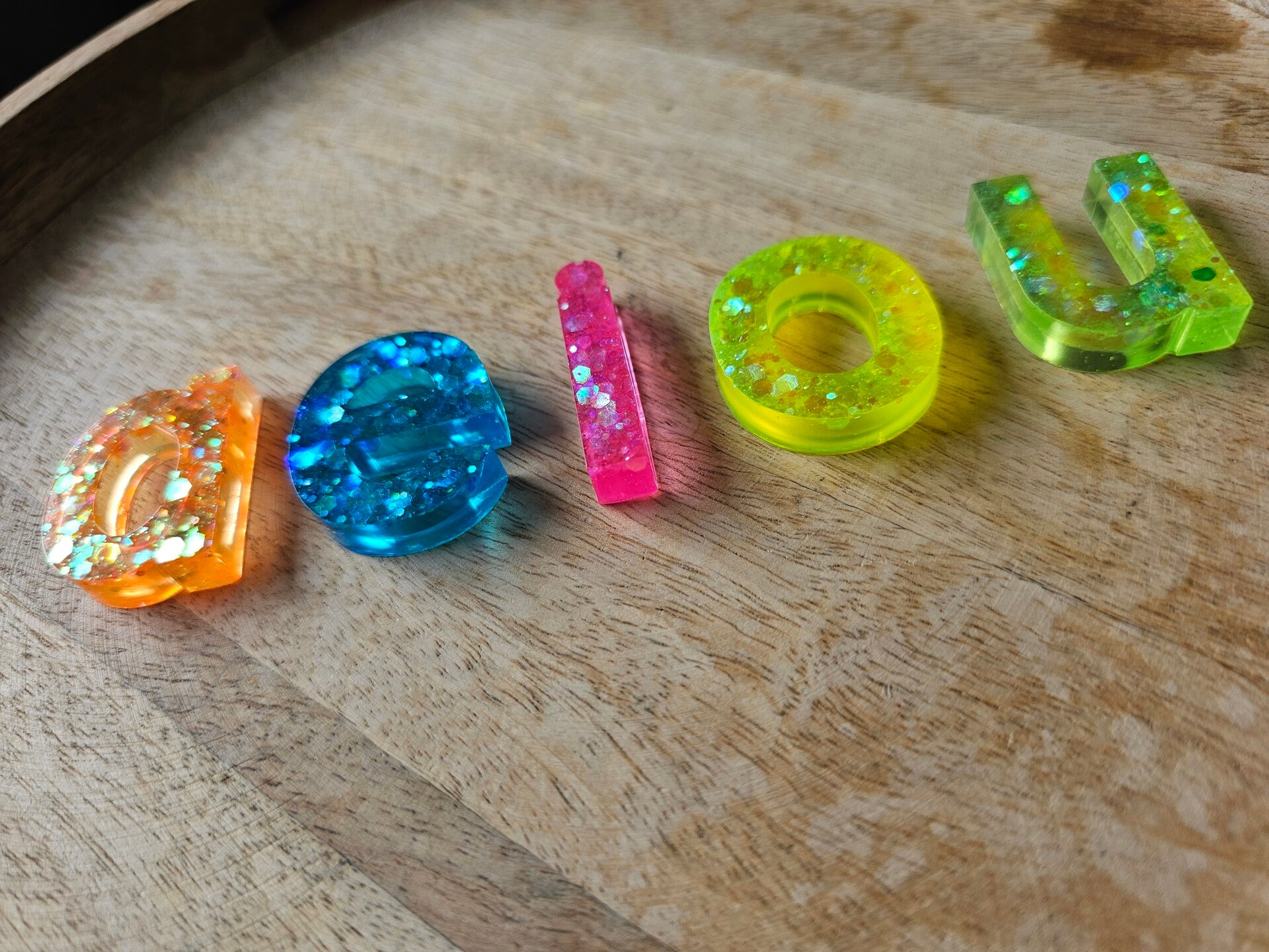 Loose parts zijn een fantastische toevoeging aan een speel/ werkplek. Deze prachtige letters zijn gemaakt van epoxy. De letters zijn doorzichtig met super veel glitters wat bijvoorbeeld een fantastisch effect geeft op een lichttafel of in een watertafel. En in een zandtafel geeft dit een super tof stempel effect.