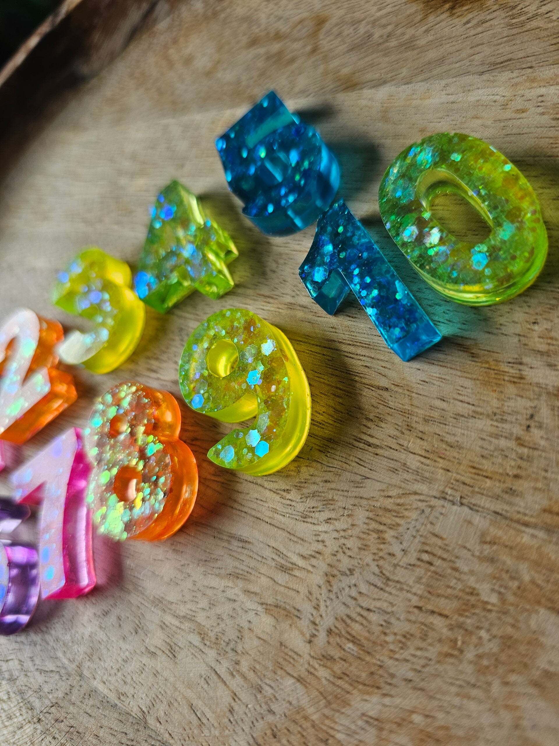 Loose parts zijn een fantastische toevoeging aan een speel/ werkplek. Deze prachtige cijfers zijn gemaakt van epoxy. De cijfers zijn doorzichtig met super veel glitters wat bijvoorbeeld een fantastisch effect geeft op een lichttafel of in een watertafel. En in een zandtafel geeft dit een super tof stempel effect.
