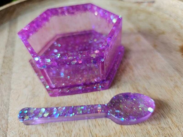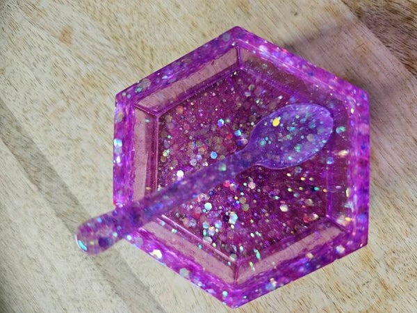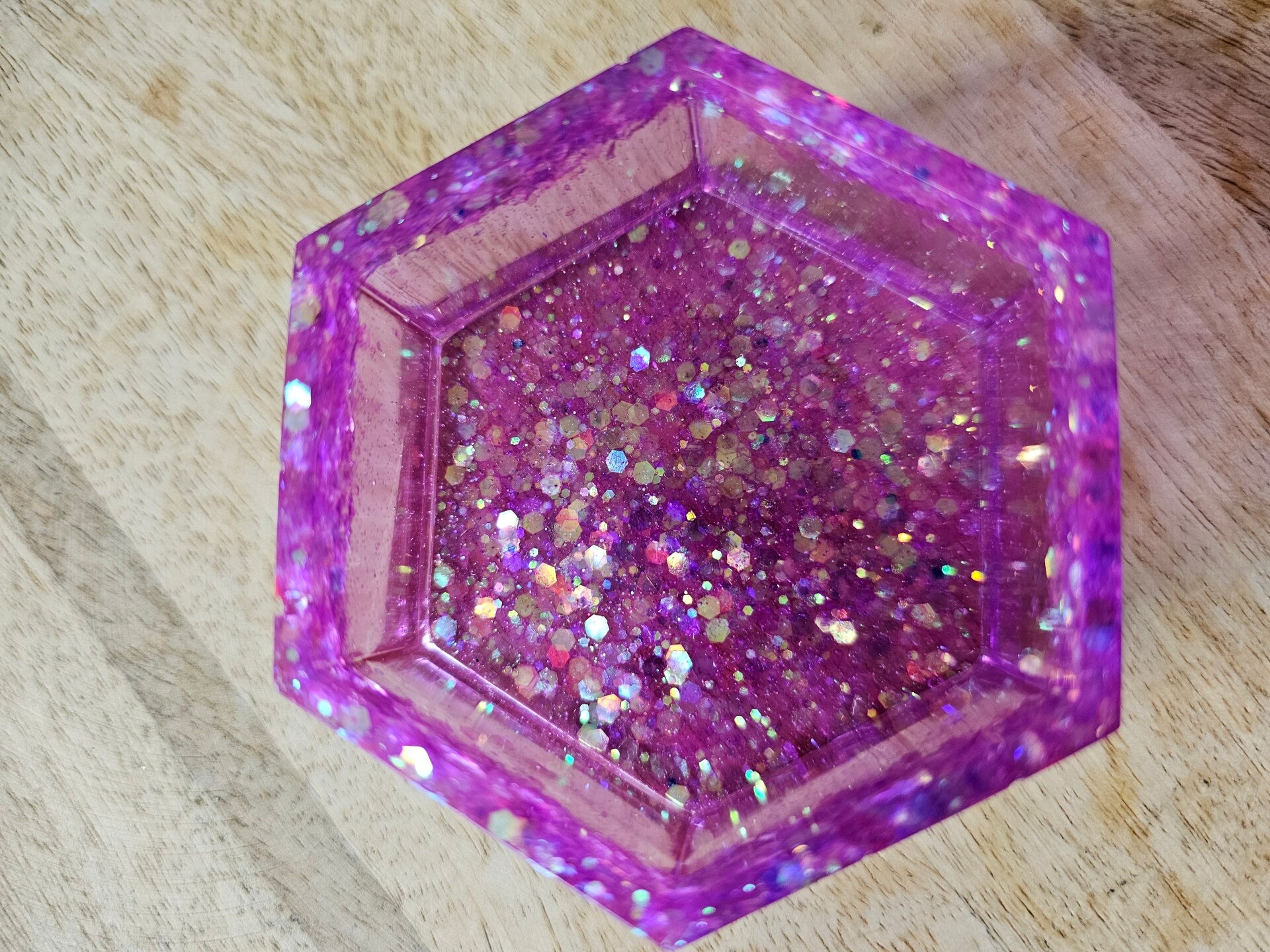 Loose parts zijn een fantastische toevoeging aan een speel/ werkplek. Dit prachtige bakje is gemaakt van epoxy. De bakjes zijn doorzichtig met super veel glitters wat bijvoorbeeld een fantastisch effect geeft op een lichttafel of in een watertafel.