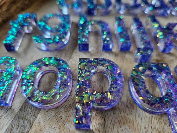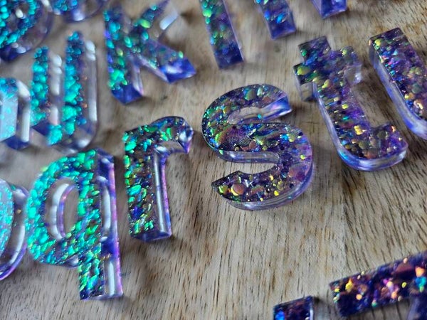 Loose parts zijn een fantastische toevoeging aan een speel/ werkplek. Deze prachtige letters zijn gemaakt van epoxy. De letters zijn doorzichtig met super veel parelmoer glitters wat bijvoorbeeld een fantastisch effect geeft op een lichttafel of in een watertafel. En in een zandtafel geeft dit een super tof stempel effect.
