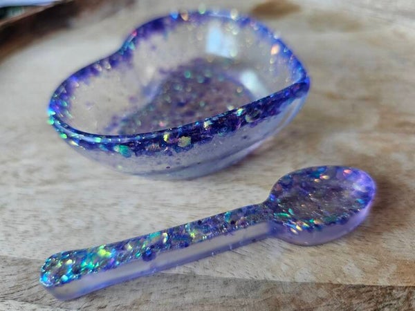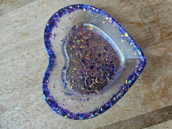 Loose parts zijn een fantastische toevoeging aan een speel/ werkplek. Dit prachtige bakje is gemaakt van epoxy. De bakjes zijn doorzichtig met super veel glitters wat bijvoorbeeld een fantastisch effect geeft op een lichttafel of in een watertafel.