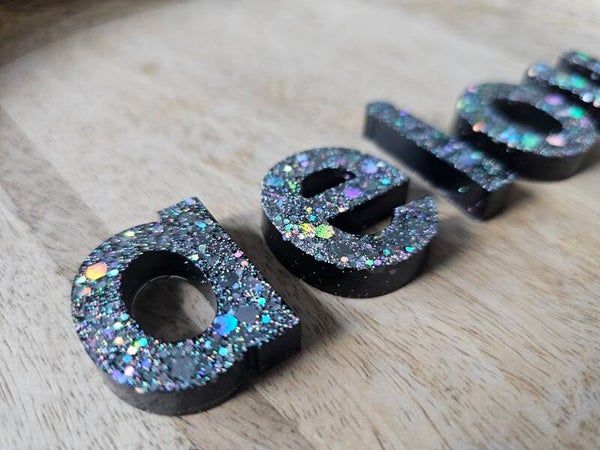 Loose parts zijn een fantastische toevoeging aan een speel/ werkplek. Deze prachtige letterset is gemaakt van epoxy. De letters zijn zwart met super veel glitters wat bijvoorbeeld een fantastisch effect geeft in een speeltafel met zand of in een watertafel.