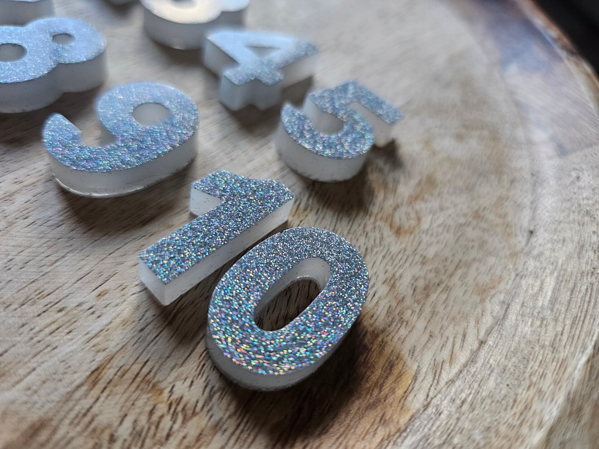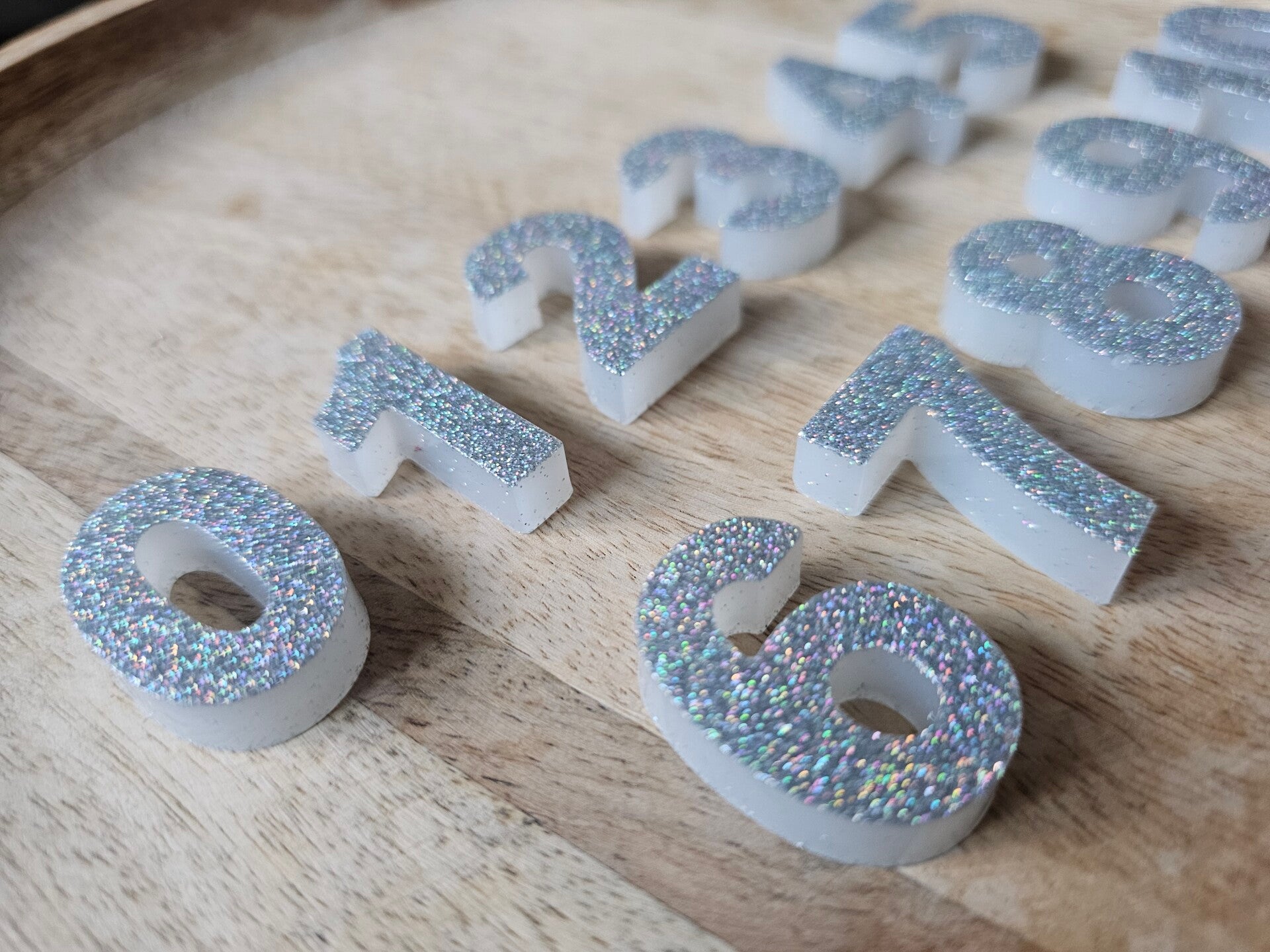 Loose parts zijn een fantastische toevoeging aan een speel/ werkplek. Deze prachtige cijfers zijn gemaakt van epoxy. De cijfers zijn wit met super veel zilveren glitters wat bijvoorbeeld een fantastisch effect geeft op een lichttafel of in een watertafel. En in een zandtafel geeft dit een super tof stempel effect.