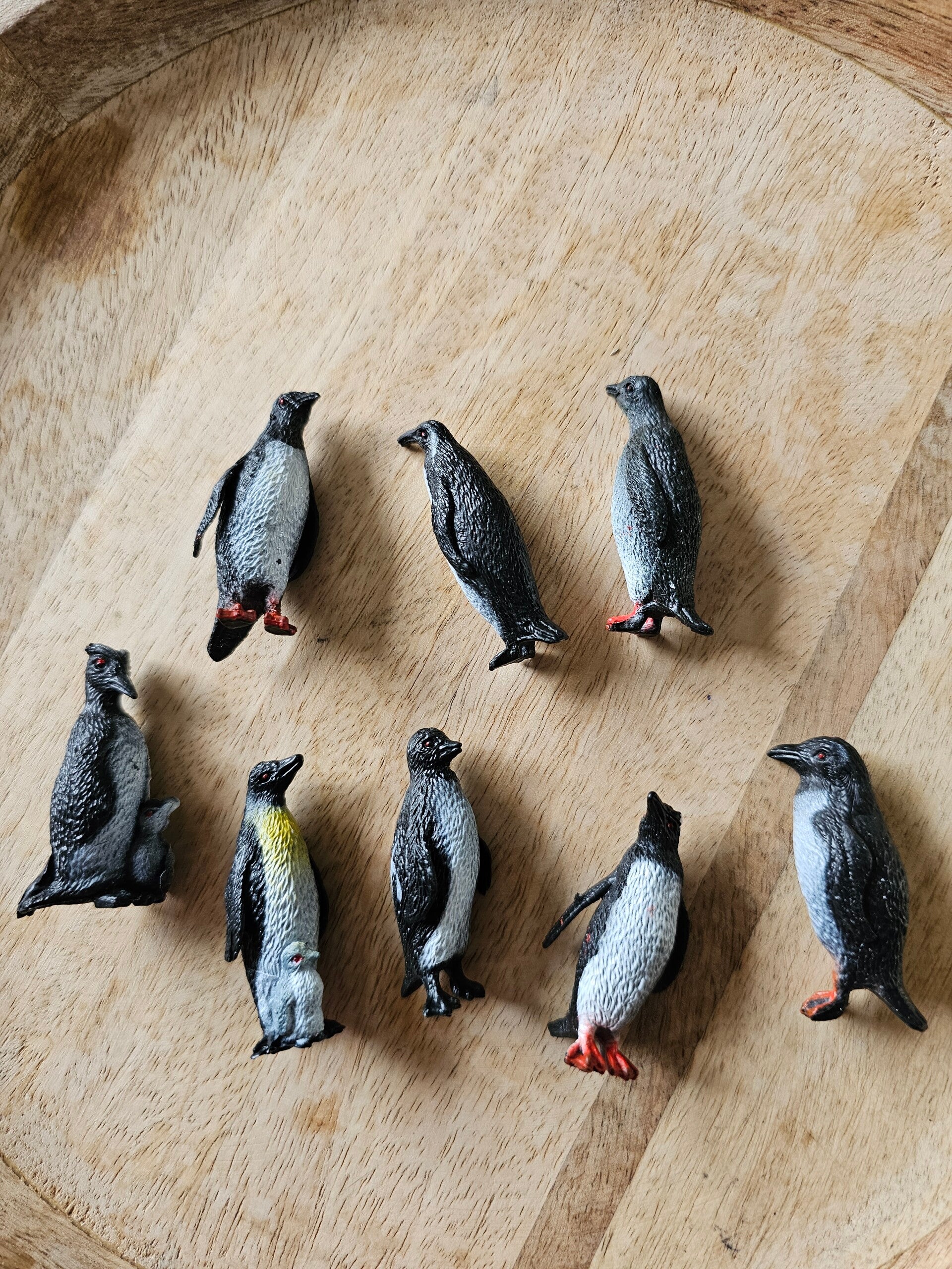 De pinguins zijn te koop in een set van 8 pinguins. Dan krijg je alle pinguins van de foto. Er is ook een set van 4 pinguins te koop. Dan krijg 4 random pinguins.