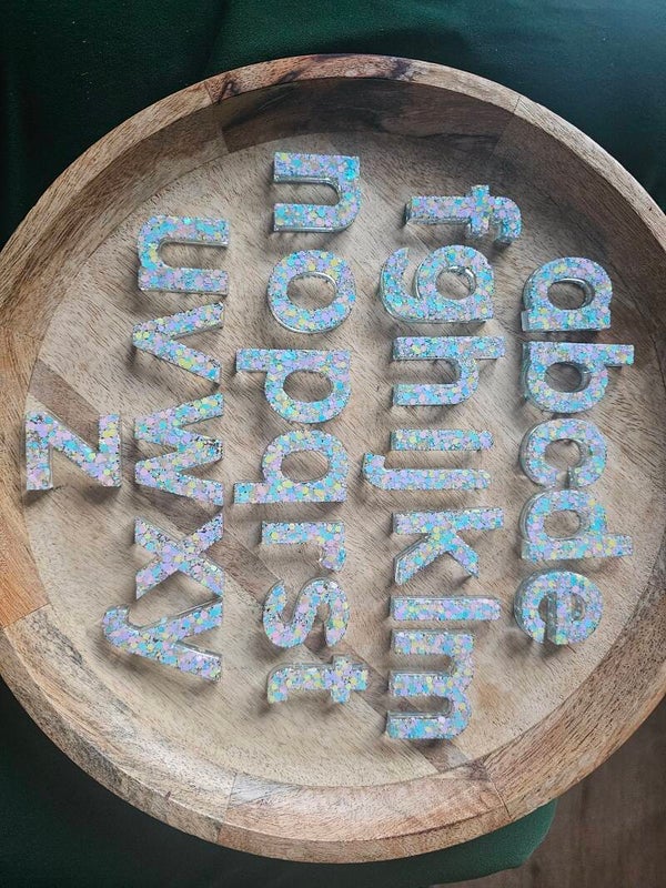 Loose parts zijn een fantastische toevoeging aan een speel/ werkplek. Deze prachtige letters zijn gemaakt van epoxy. De letters zijn doorzichtig met super veel pastelkleurige glitters wat bijvoorbeeld een fantastisch effect geeft op een lichttafel of in een watertafel. En in een zandtafel geeft dit een super tof stempel effect.