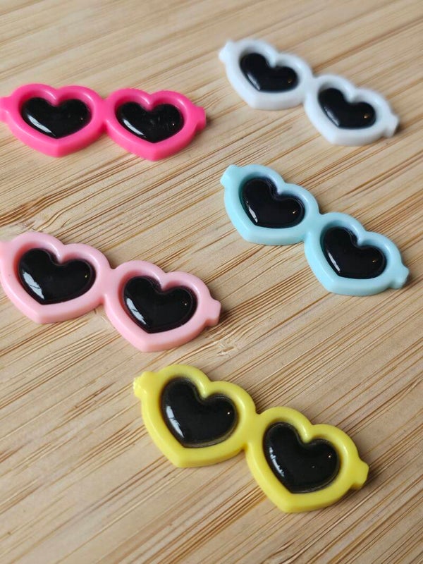 De zonnebrillen zijn gemaakt van acryl en ze zijn in allerlei vrolijke kleuren.