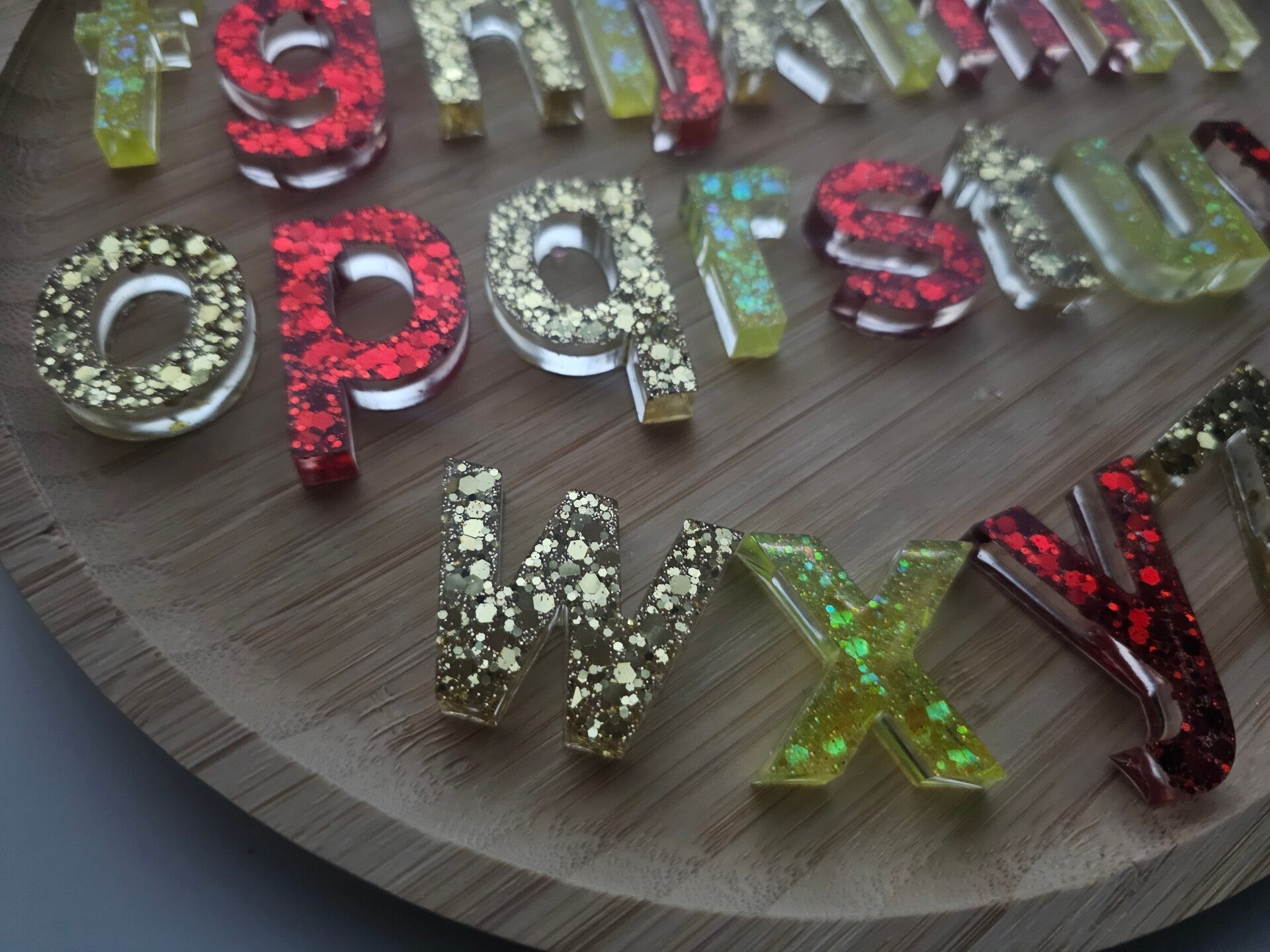 Loose parts zijn een fantastische toevoeging aan een speel/ werkplek. Deze prachtige letters zijn gemaakt van epoxy. De letters zijn doorzichtig met super veel kleurige glitters wat bijvoorbeeld een fantastisch effect geeft op een lichttafel of in een watertafel. En in een zandtafel geeft dit een super tof stempel effect.