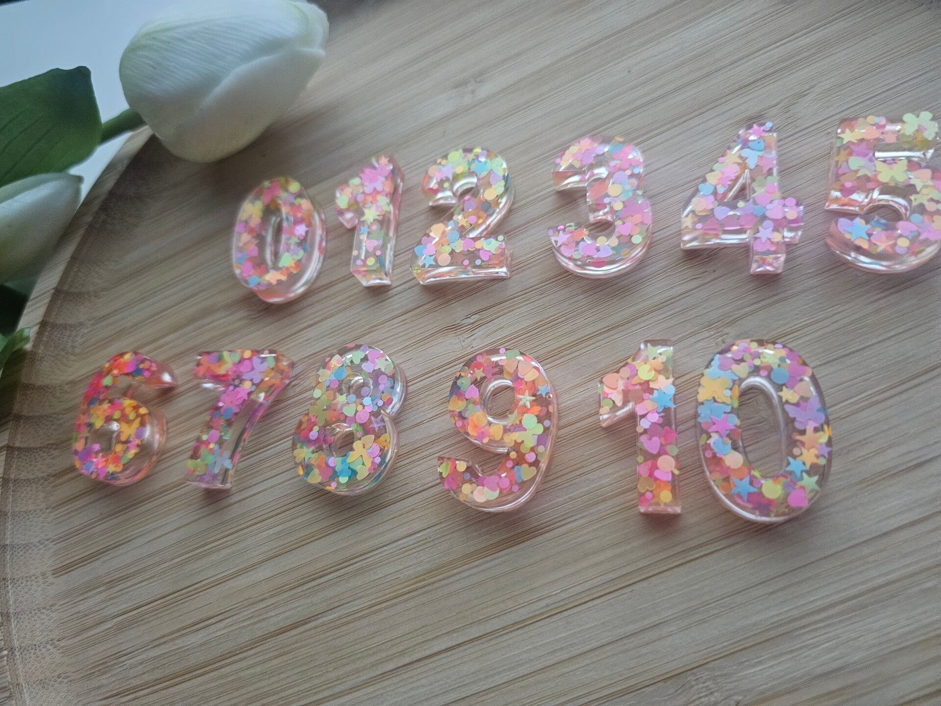 Loose parts zijn een fantastische toevoeging aan een speel/ werkplek. Deze prachtige cijfers zijn gemaakt van epoxy. De cijfers zijn doorzichtig met super veel kleurige glitters wat bijvoorbeeld een fantastisch effect geeft op een lichttafel of in een watertafel. En in een zandtafel geeft dit een super tof stempel effect.