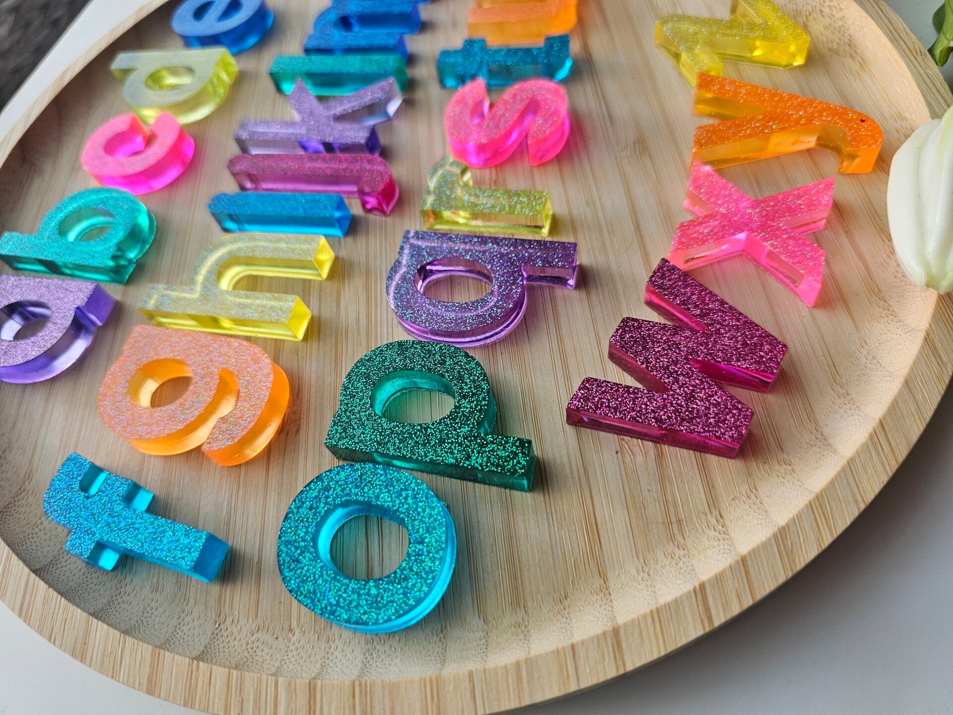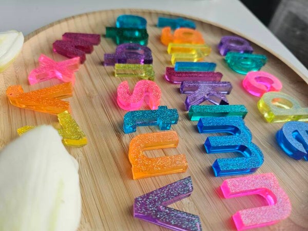 Loose parts zijn een fantastische toevoeging aan een speel/ werkplek. Deze prachtige letters zijn gemaakt van epoxy. De letters zijn doorzichtig met super veel glitters wat bijvoorbeeld een fantastisch effect geeft op een lichttafel of in een watertafel. En in een zandtafel geeft dit een super tof stempel effect.