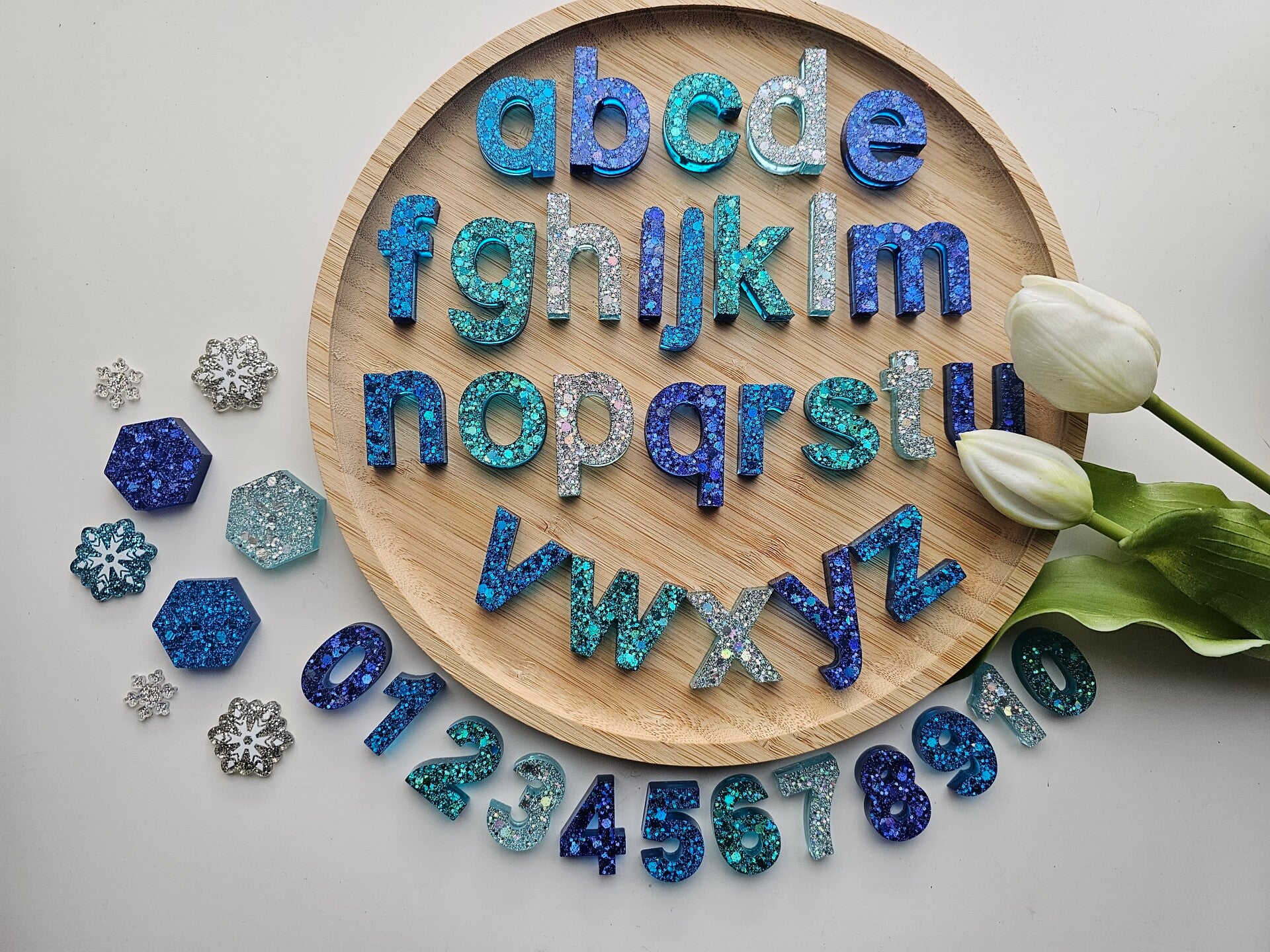 Loose parts zijn een fantastische toevoeging aan een speel/ werkplek. Deze prachtige letters zijn gemaakt van epoxy. De letters zijn doorzichtig gekleurd met super veel glitters wat bijvoorbeeld een fantastisch effect geeft op een lichttafel of in een watertafel. En in een zandtafel geeft dit een super tof stempel effect. De set heeft prachtige winter en waterkleuren.