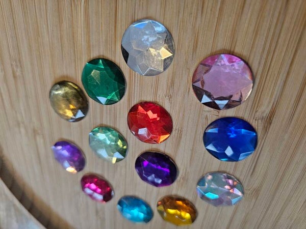 Loose parts zijn een fantastische toevoeging aan een speel/ werkplek. Deze prachtige glinsterstenen lijken net schatten. Kinderen vinden het prachtige glinsterobjecten en leggen er hele mandela's mee.