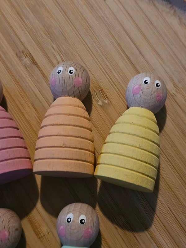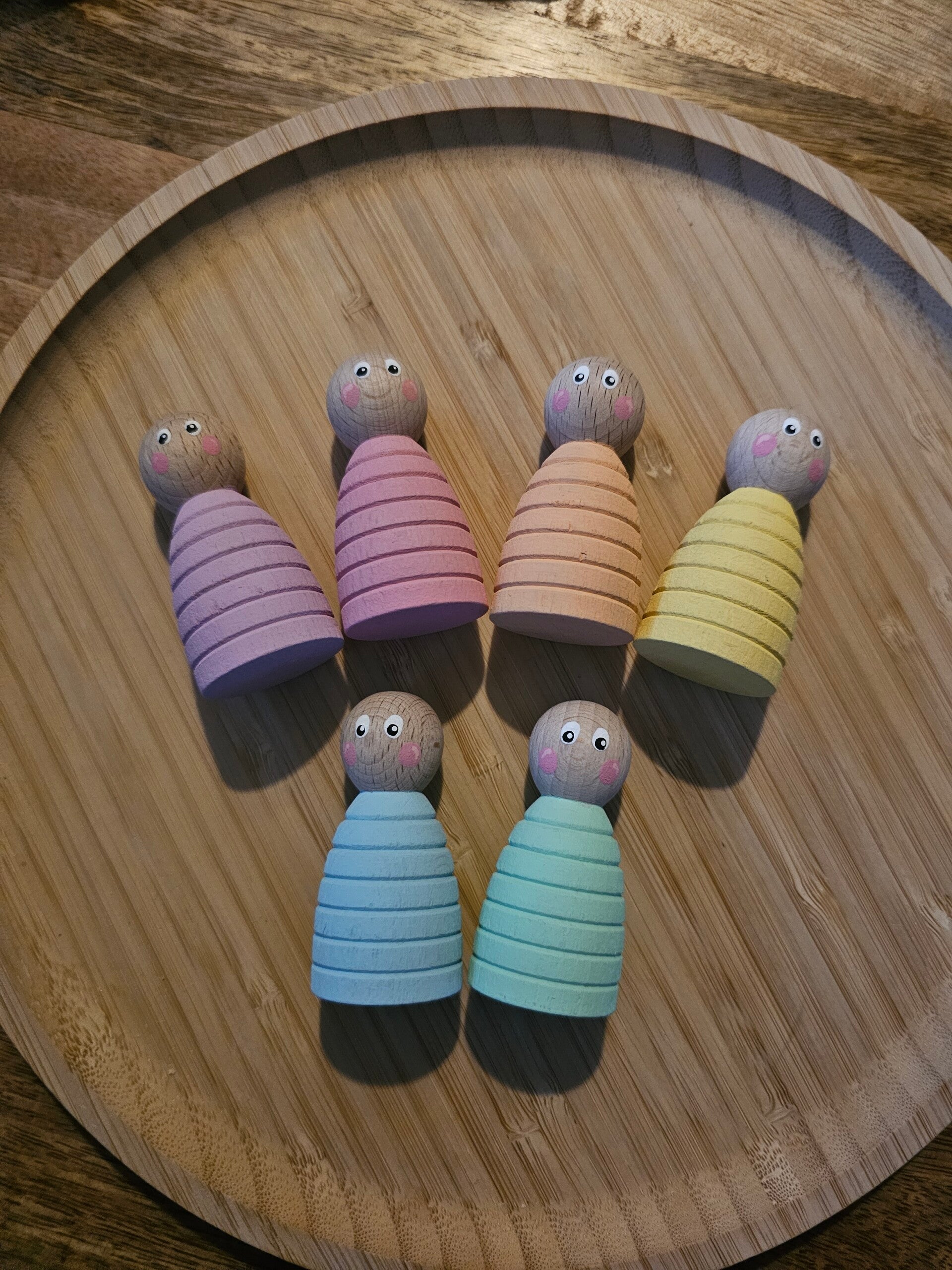 Deze lieve handbeschilderde pegdolls zijn perfect in de speelbak. In de set zitten 6 verschillende pastelkleurige pegdolls.