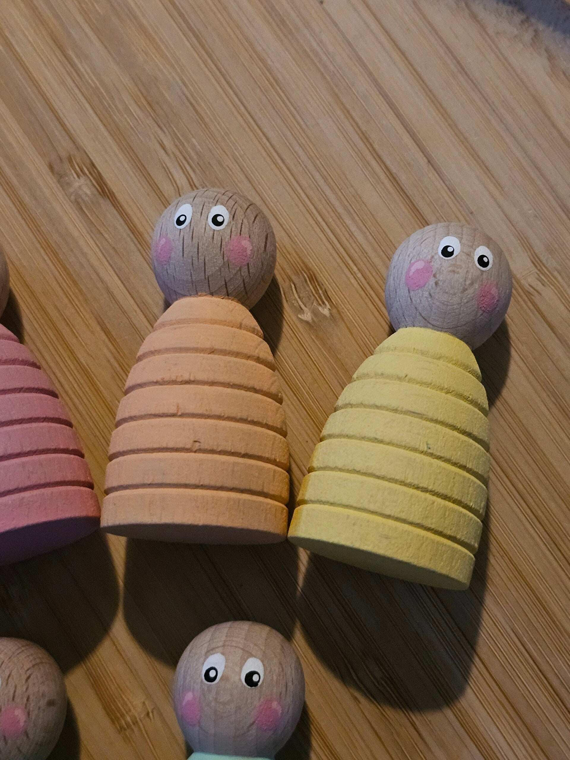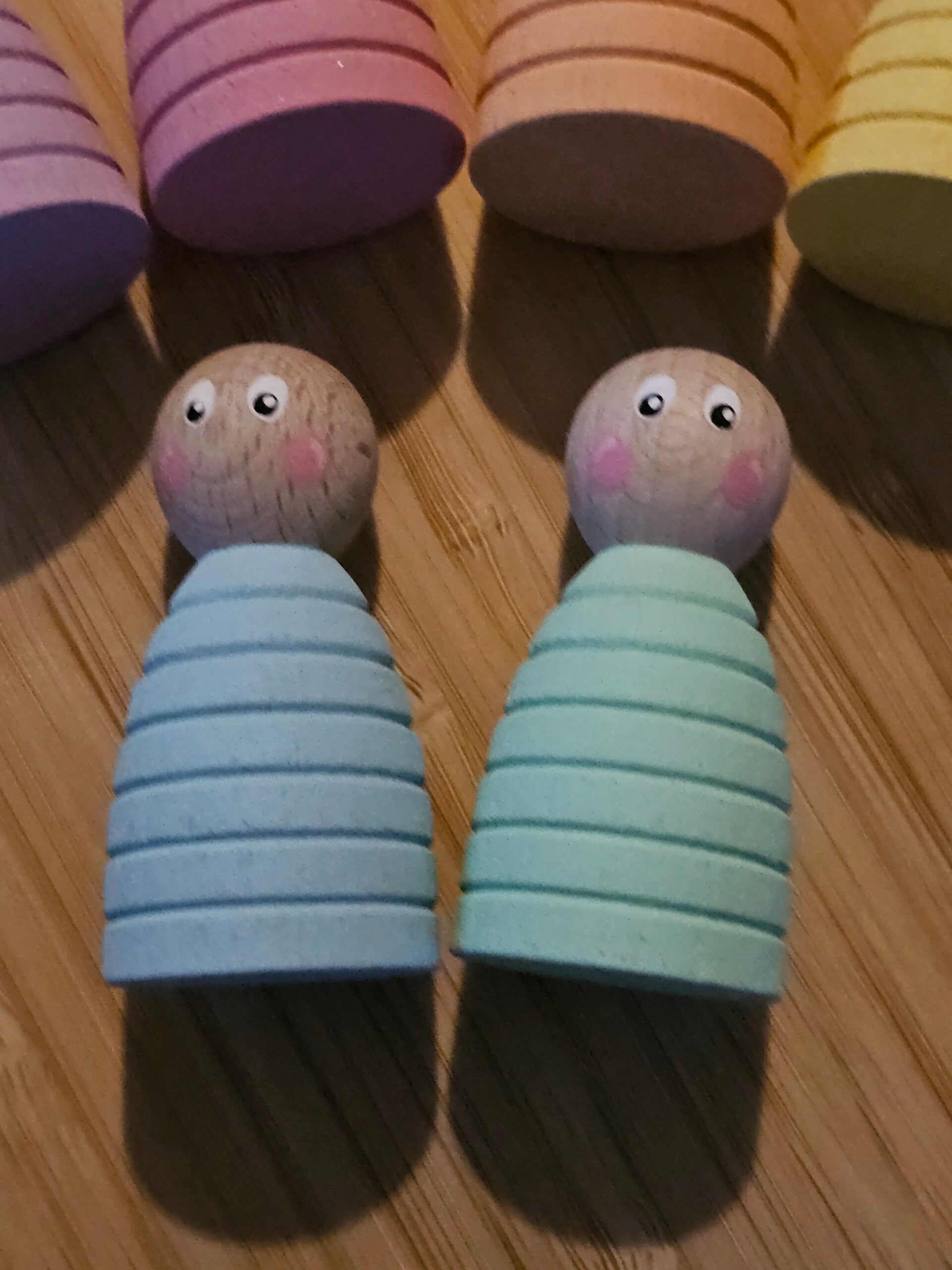 Deze pastelkleurige pegdolls maken het spelen met loose parts, het poppenhuis, in de bouwhoek nog leuker. Kinderen kunnen er helemaal op los gaan met hun fantasie. Wij kiezen er bewust ervoor om de gezichten houtkleur te laten. Zo kan ieder kind zich in het poppetje vinden. Ook maken wij geen gebruik van mondjes zodat elk poppetje een emotie van het kind kan krijgen.