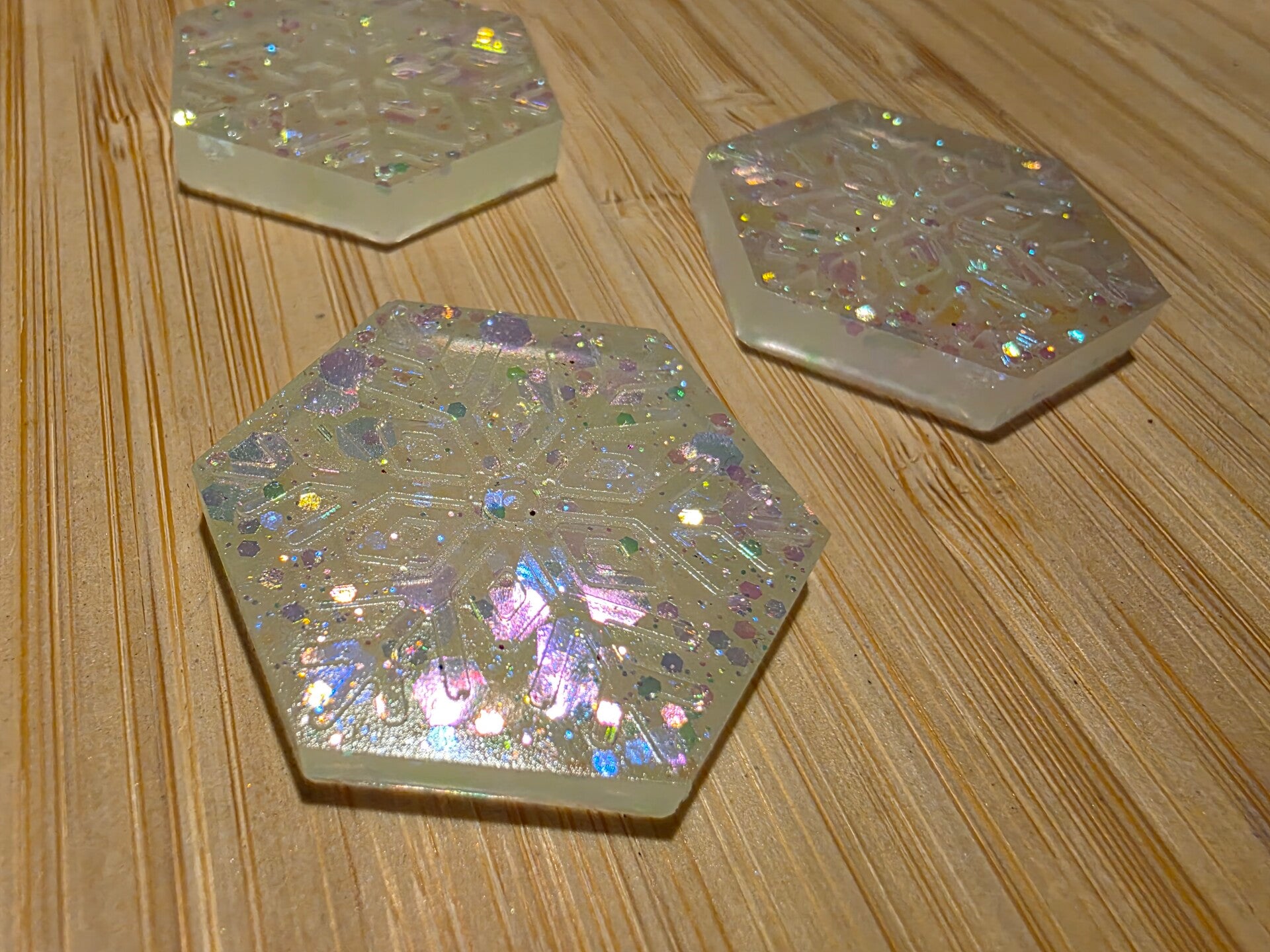 Loose parts zijn een fantastische toevoeging aan een speel/ werkplek. Dezw sneeuwvlokken zijn gemaakt van epoxy. De sneeuwvlokken zijn (deels) doorzichtig met super mooie glitters wat bijvoorbeeld een fantastisch effect geeft op een lichttafel of in een watertafel. De sneeuwvlokken hebben een relief waardoor ze ook kunnen stempelen.
