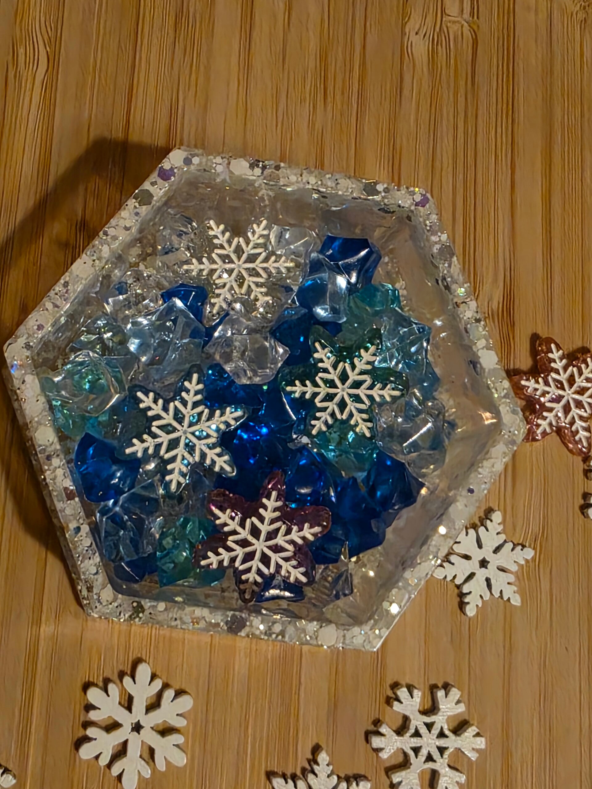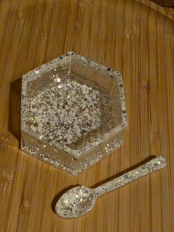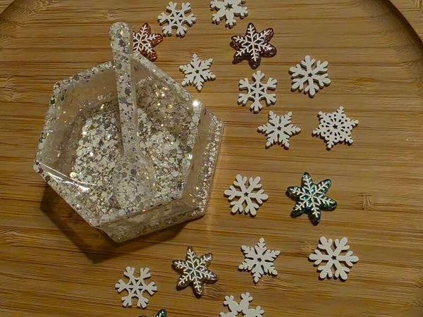 Loose parts zijn een fantastische toevoeging aan een speel/ werkplek. Dit prachtige bakje is gemaakt van epoxy. De bakjes zijn doorzichtig met super veel glitters wat lijkt op sneeuw met wat gouden glitters. Wat bijvoorbeeld een fantastisch effect geeft op een lichttafel of in een watertafel.