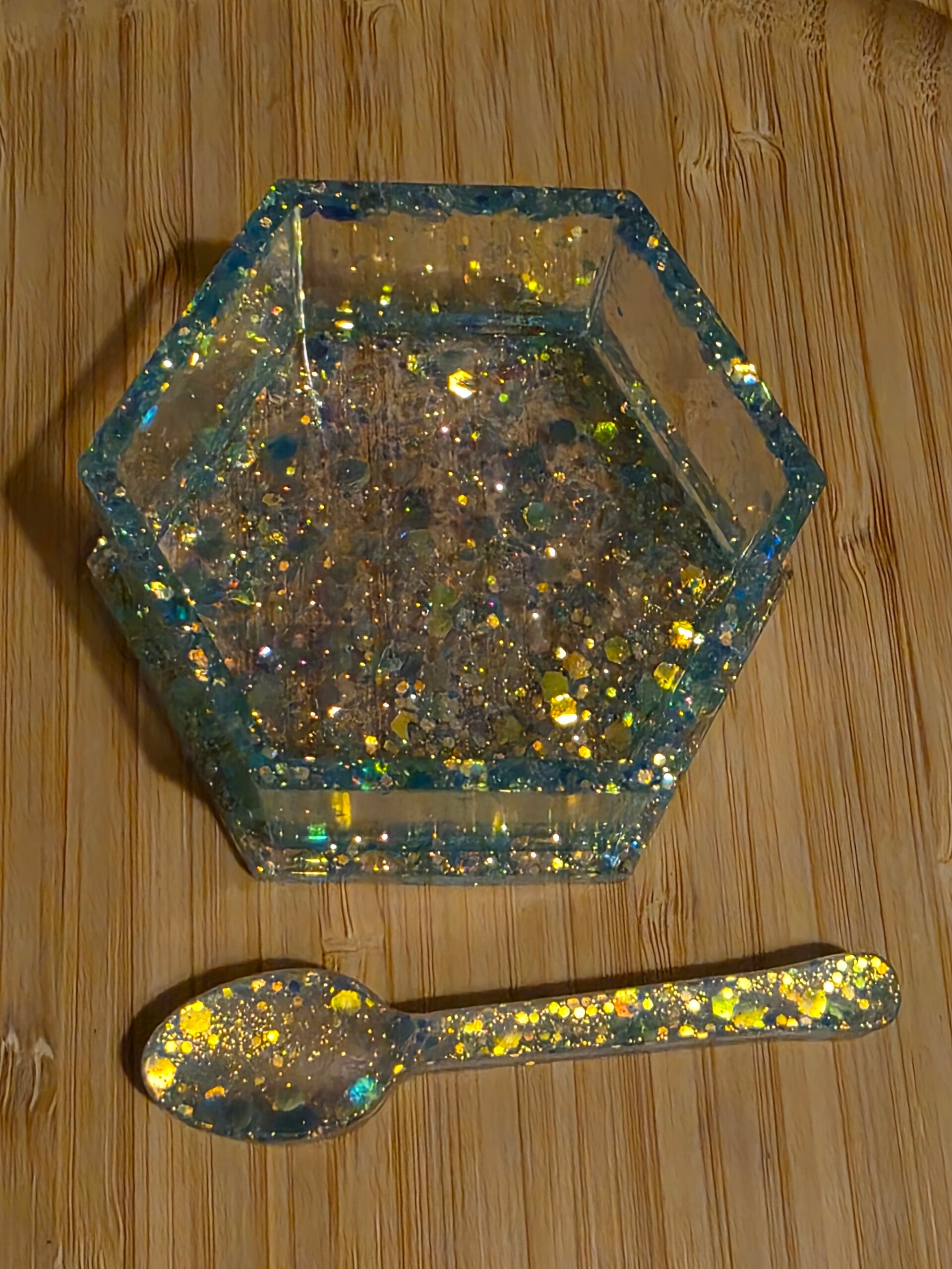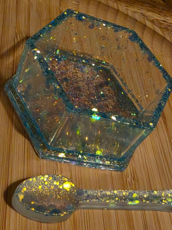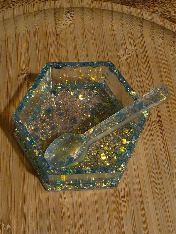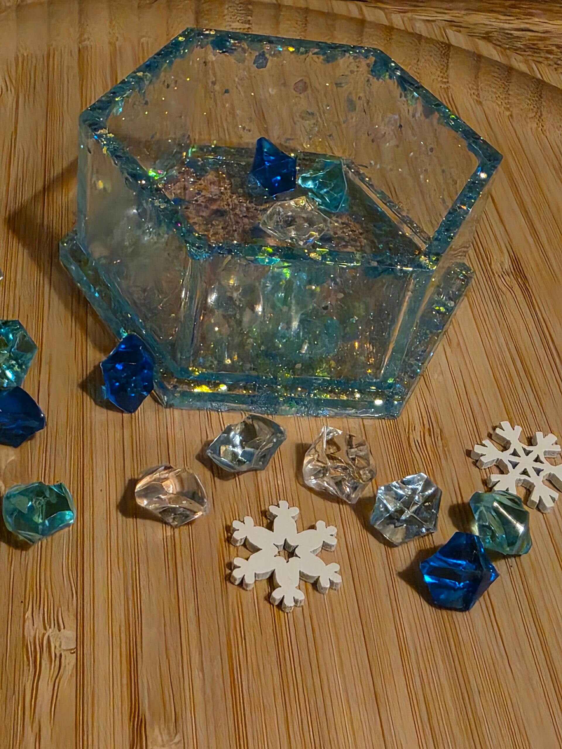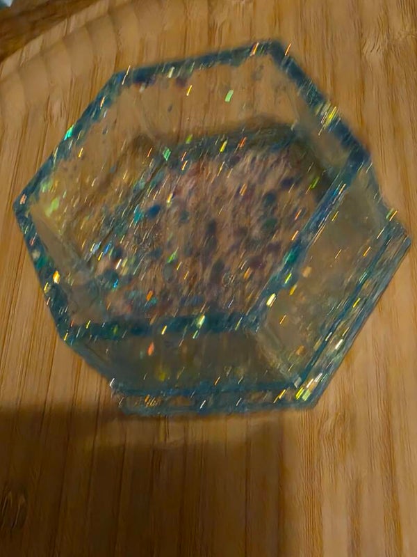 Loose parts zijn een fantastische toevoeging aan een speel/ werkplek. Dit prachtige bakje is gemaakt van epoxy. De bakjes zijn doorzichtig met super veel blauwe glitters wat lijkt op water. Wat bijvoorbeeld een fantastisch effect geeft op een lichttafel of in een watertafel.