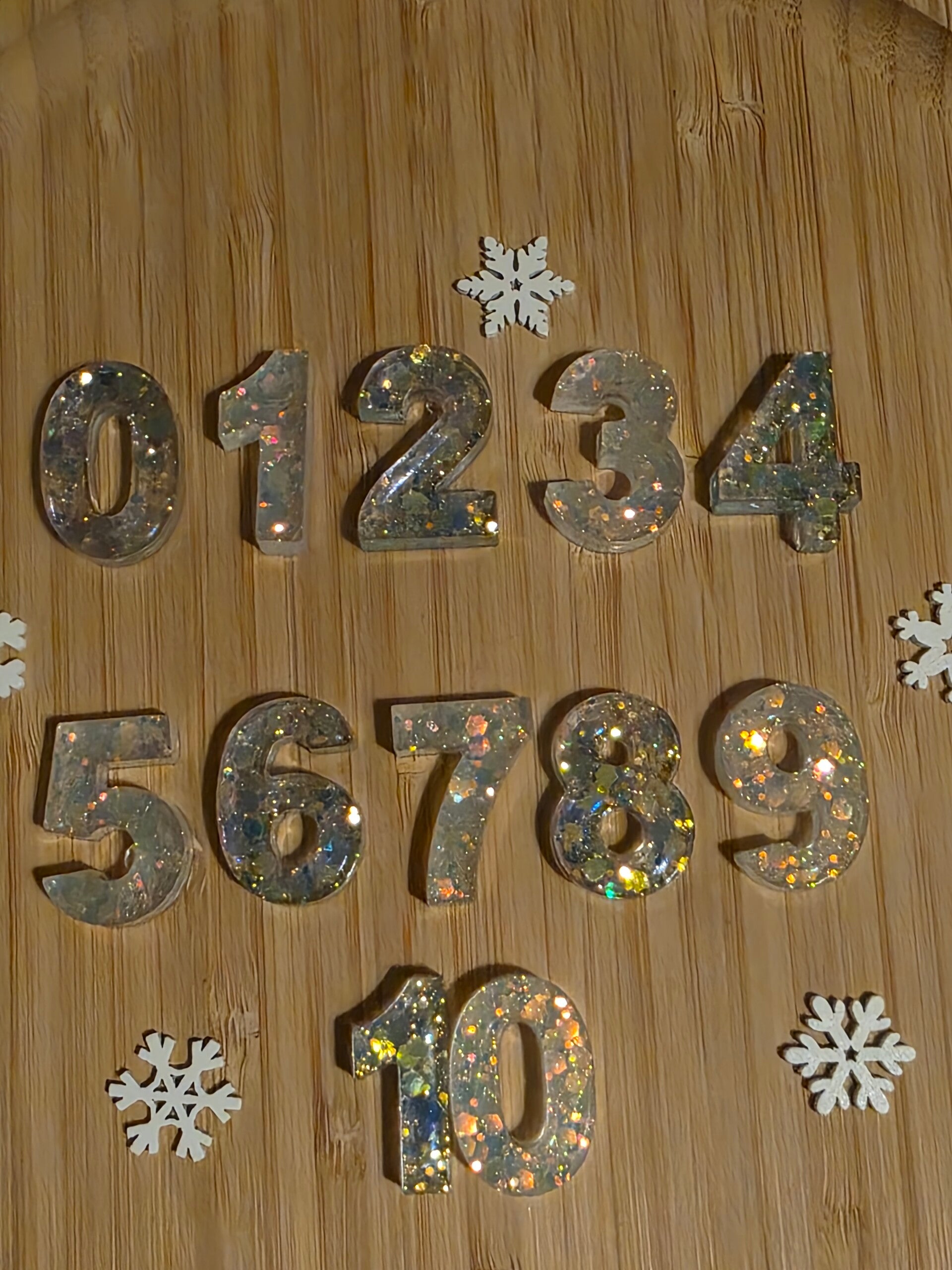 Loose parts zijn een fantastische toevoeging aan een speel/ werkplek. Deze prachtige cijfers zijn gemaakt van epoxy. De cijfers zijn doorzichtig gekleurd met super veel glitters wat bijvoorbeeld een fantastisch effect geeft op een lichttafel of in een watertafel. En in een zandtafel geeft dit een super tof stempel effect. De set heeft prachtige winter en waterkleuren.