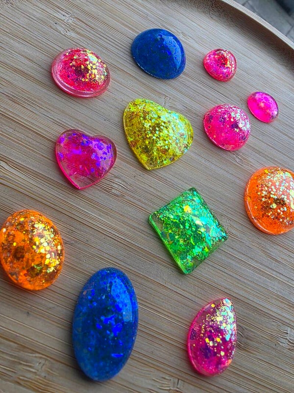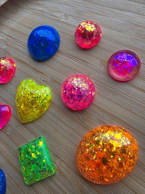Loose parts zijn een fantastische toevoeging aan een speel/ werkplek. Deze prachtige loose parts zijn gemaakt van epoxy. De stenen zijn doorzichtig met super veel kleurige glitters wat bijvoorbeeld een fantastisch effect geeft op een lichttafel of in een watertafel. En in een zandtafel geeft dit een super tof stempel effect.