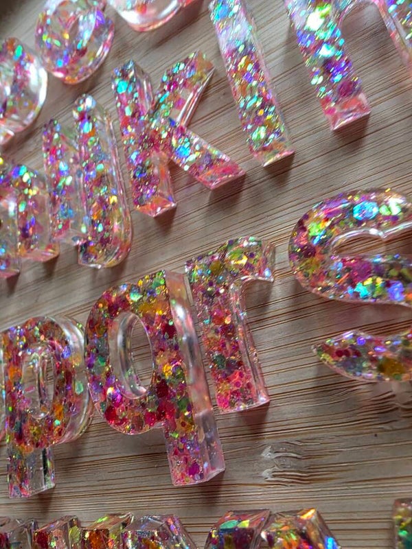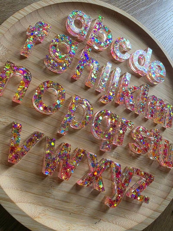 Loose parts zijn een fantastische toevoeging aan een speel/ werkplek. Deze prachtige letters zijn gemaakt van epoxy. De letters zijn doorzichtig met super kleurige glitters wat bijvoorbeeld een fantastisch effect geeft op een lichttafel of in een watertafel. En in een zandtafel geeft dit een super tof stempel effect.