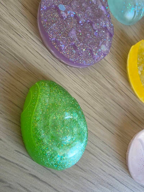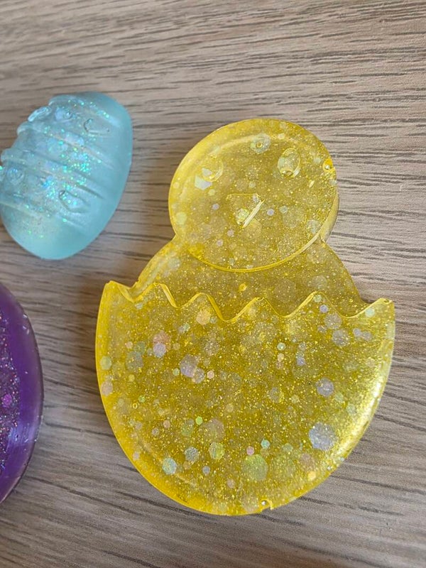 Loose parts zijn een fantastische toevoeging aan een speel/ werkplek. Deze prachtige loose parts zijn gemaakt van epoxy. De Paasfiguren zijn licht doorzichtig met kleurige glitters wat bijvoorbeeld een fantastisch effect geeft op een lichttafel of in een watertafel. En in een zandtafel geeft dit een super tof stempel effect.