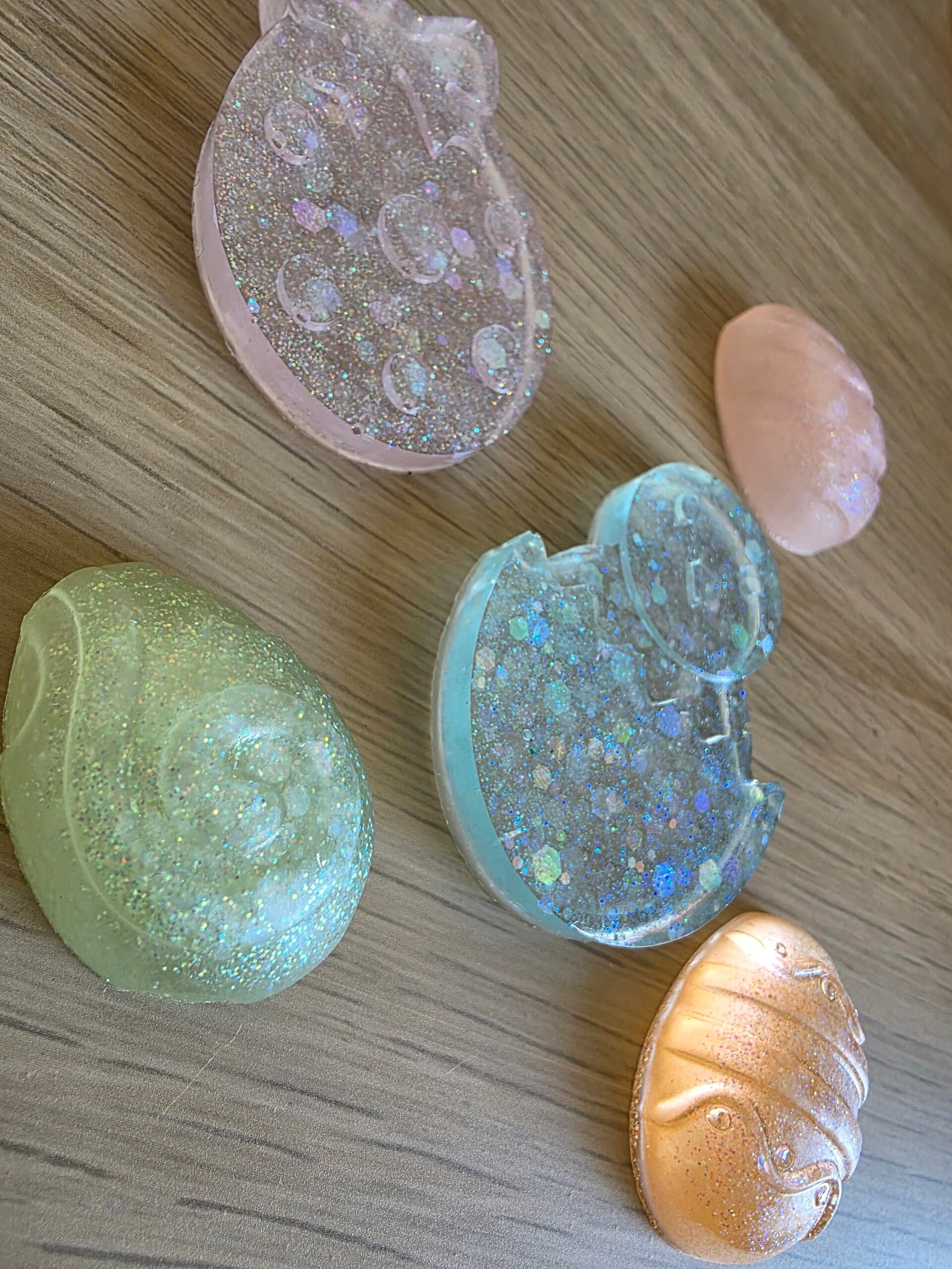 Loose parts zijn een fantastische toevoeging aan een speel/ werkplek. Deze prachtige loose parts zijn gemaakt van epoxy. De Paasfiguren zijn licht doorzichtig met kleurige glitters wat bijvoorbeeld een fantastisch effect geeft op een lichttafel of in een watertafel. En in een zandtafel geeft dit een super tof stempel effect.