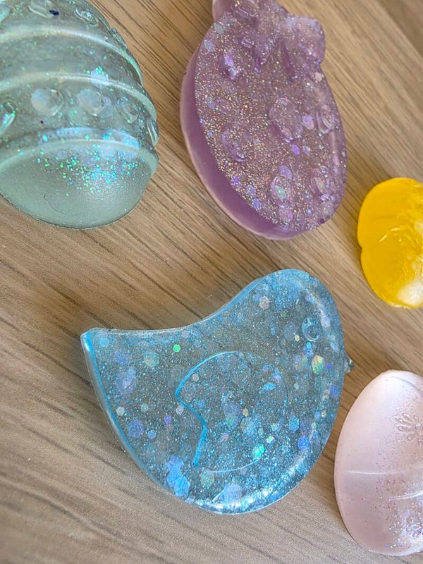 Loose parts zijn een fantastische toevoeging aan een speel/ werkplek. Deze prachtige loose parts zijn gemaakt van epoxy. De Paasfiguren zijn licht doorzichtig met kleurige glitters wat bijvoorbeeld een fantastisch effect geeft op een lichttafel of in een watertafel. En in een zandtafel geeft dit een super tof stempel effect.
