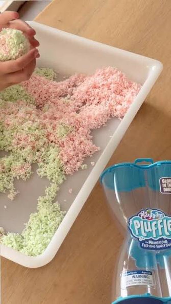 Pluffle is een fantastisch sensorisch speelmateriaal. Pluffle droogt nooit uit. Het is een pplayfoam. Het kan gebruikt worden in een sensomotorische tafel met schepjes, loose parts, pincetten etc.